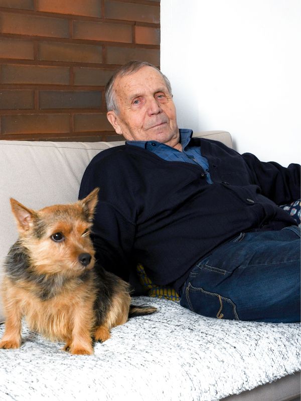 Asukkaita viihdyttää myös kaksi Norwichinterrieriä, joka saattavat sohvalla liimautua kylkeen kiinni nauttimaan rapsutuksista. Tutkitusti eläinten silittäminen vapauttaa mielihyvähormoneja, jotka rauhoittavat ja rentouttavat mieltä.
